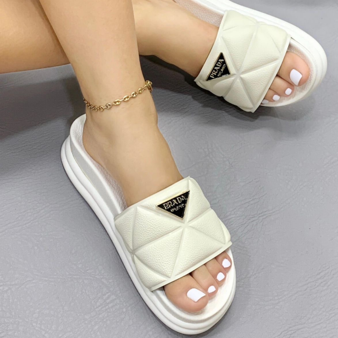 “Distinción en cada paso 💎 Sandalia PRADA con diseño exclusivo y firma en acero inoxidable.”